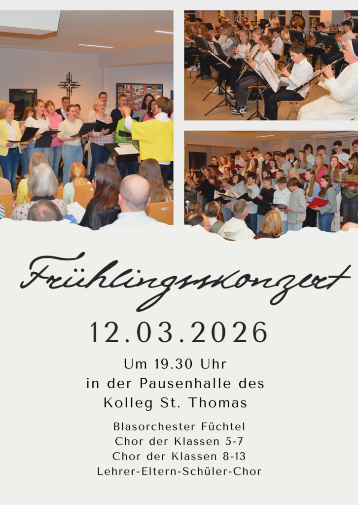 Die Musik-AGs unserer Schule laden herzlich ein zum diesjährigen Frühlingskonzert am Donnerstag, dem 12. März, um 19.30 Uhr in der Pausenhalle unseres Kolleg St. Thomas.